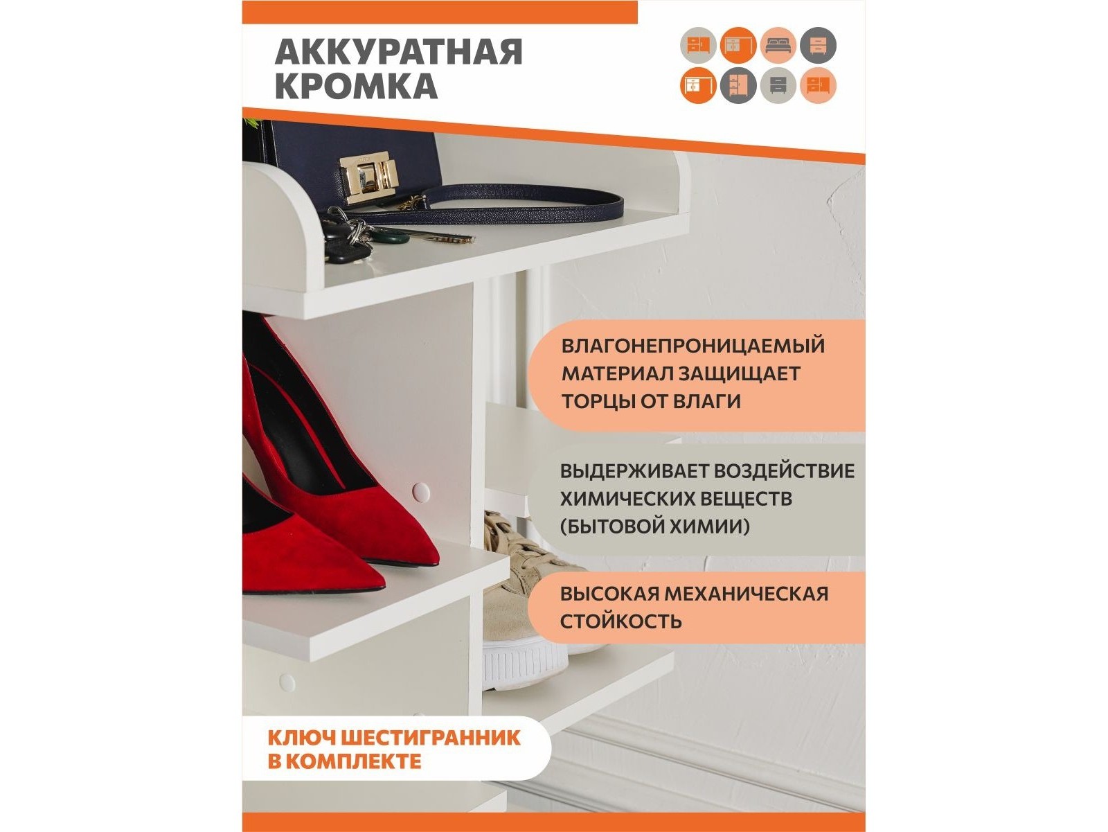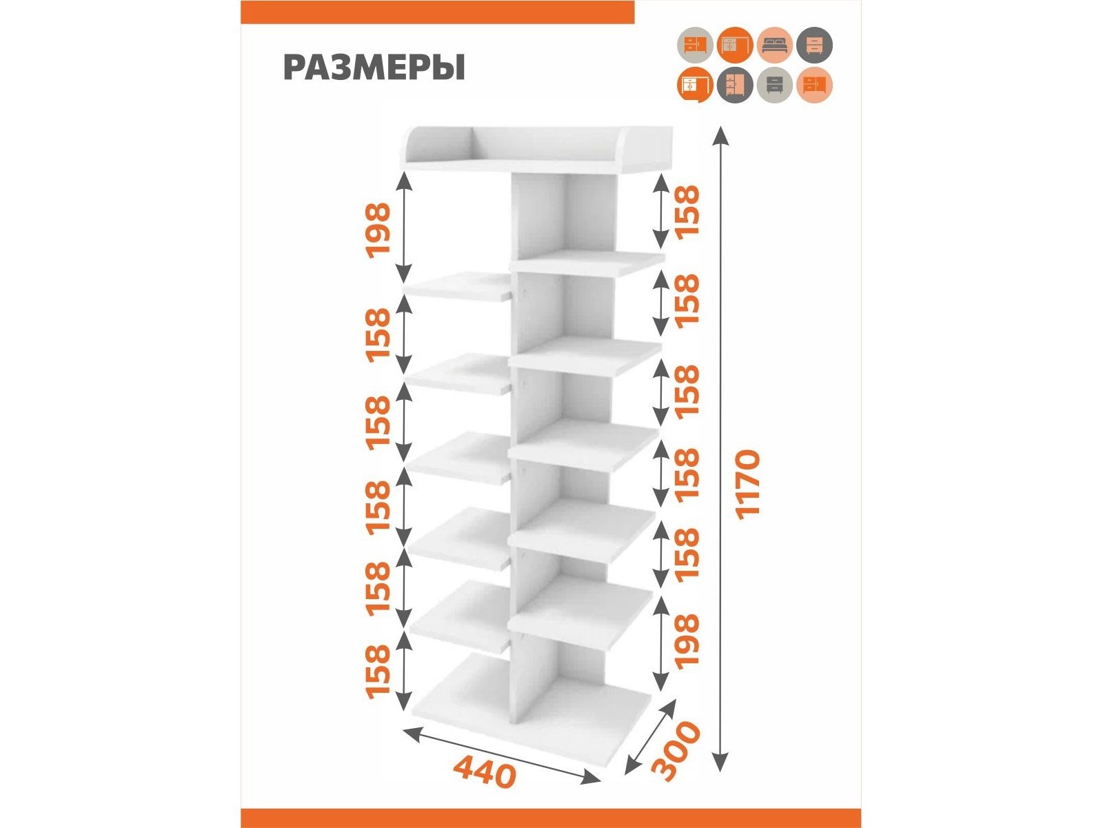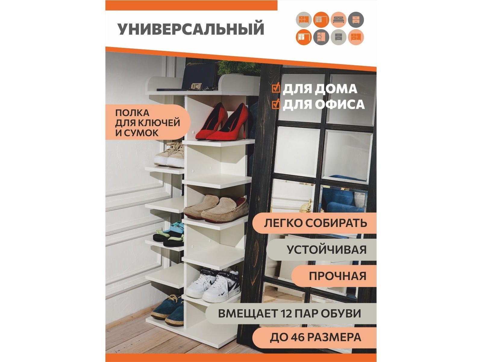 Высокая и узкая обувница для обуви - экономия пространства в небольшом коридоре или прихожей. Открытые полки позволяют быстро находить нужную пару, а также компактная стойка вмещает обувь до 46-го размера, состоит из 12 полок + 1 верхняя длинная полочка для сумки и ключей.