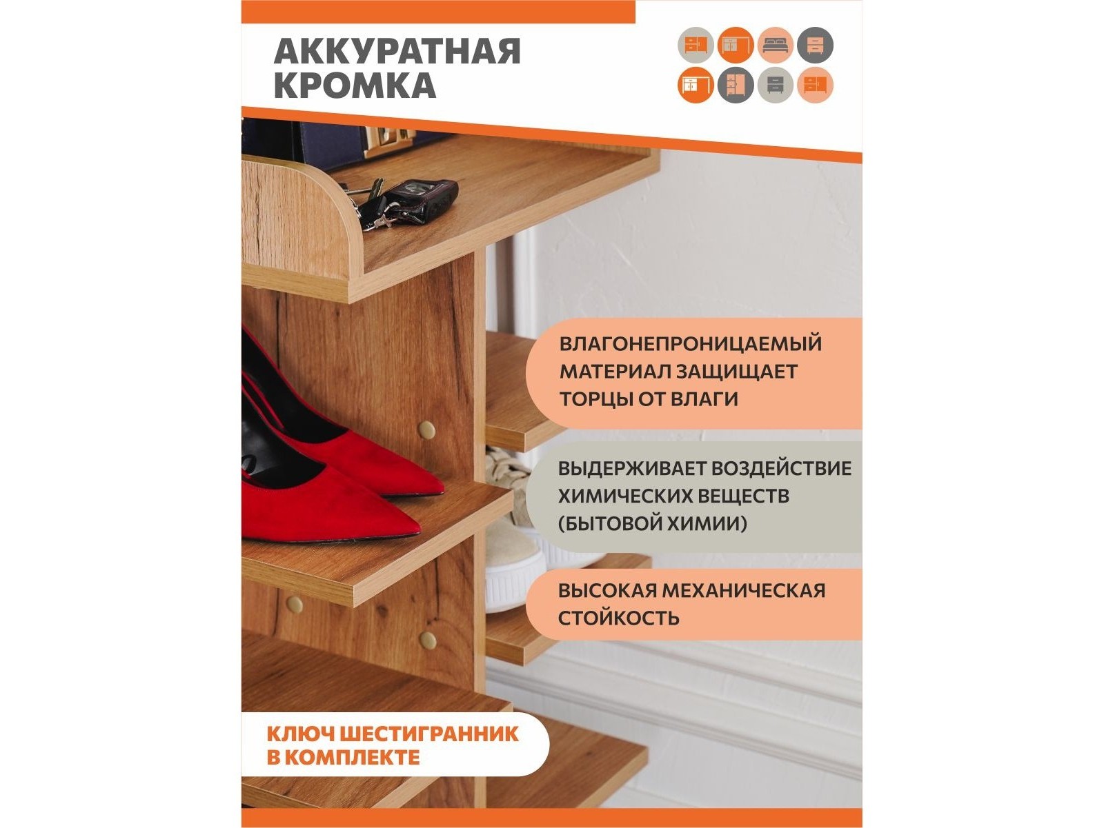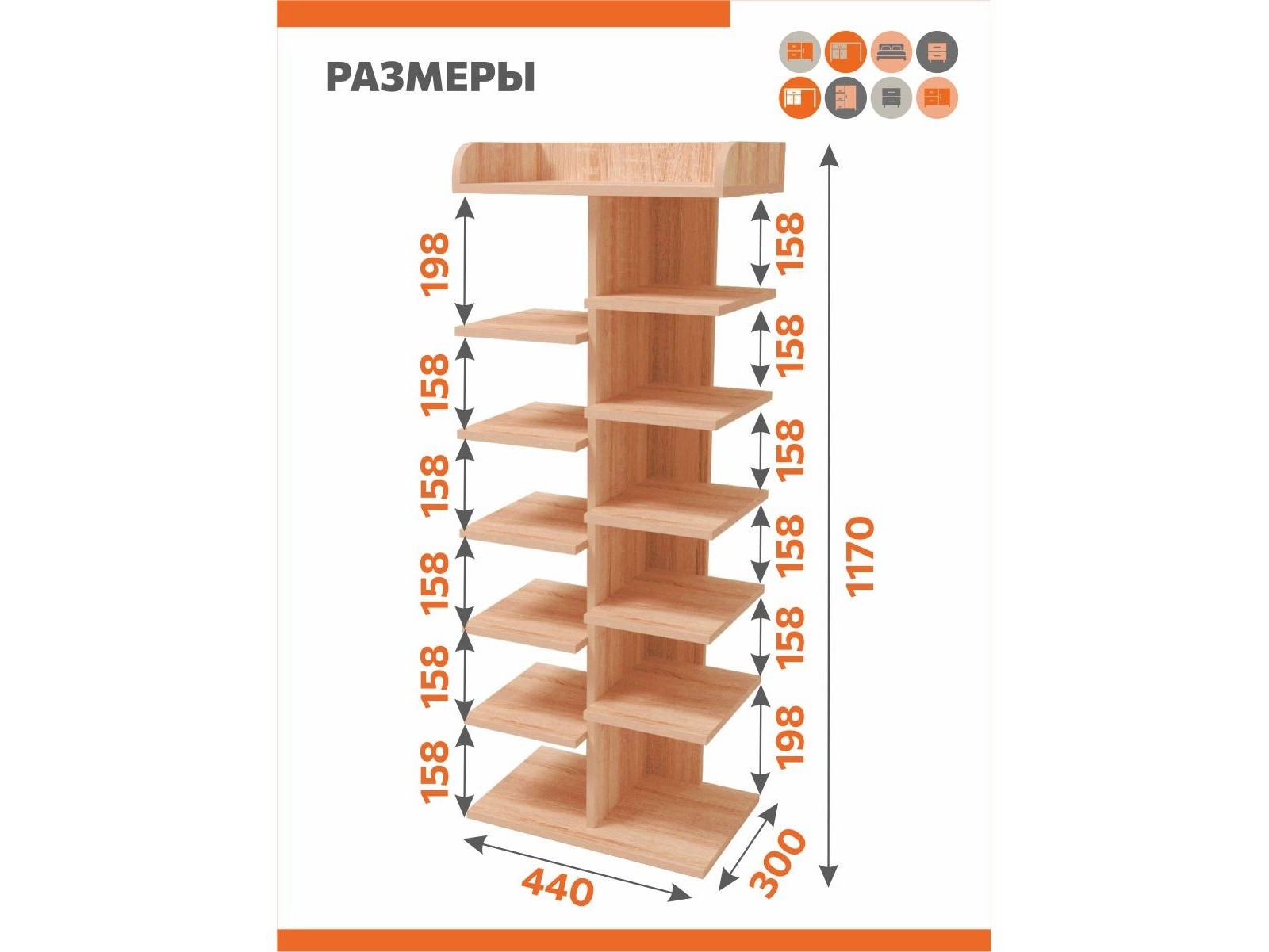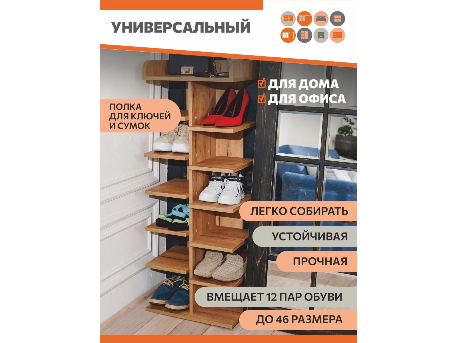 Высокая и узкая обувница для обуви - экономия пространства в небольшом коридоре или прихожей. Открытые полки позволяют быстро находить нужную пару, а также компактная стойка вмещает обувь до 46-го размера, состоит из 12 полок + 1 верхняя длинная полочка для сумки и ключей.