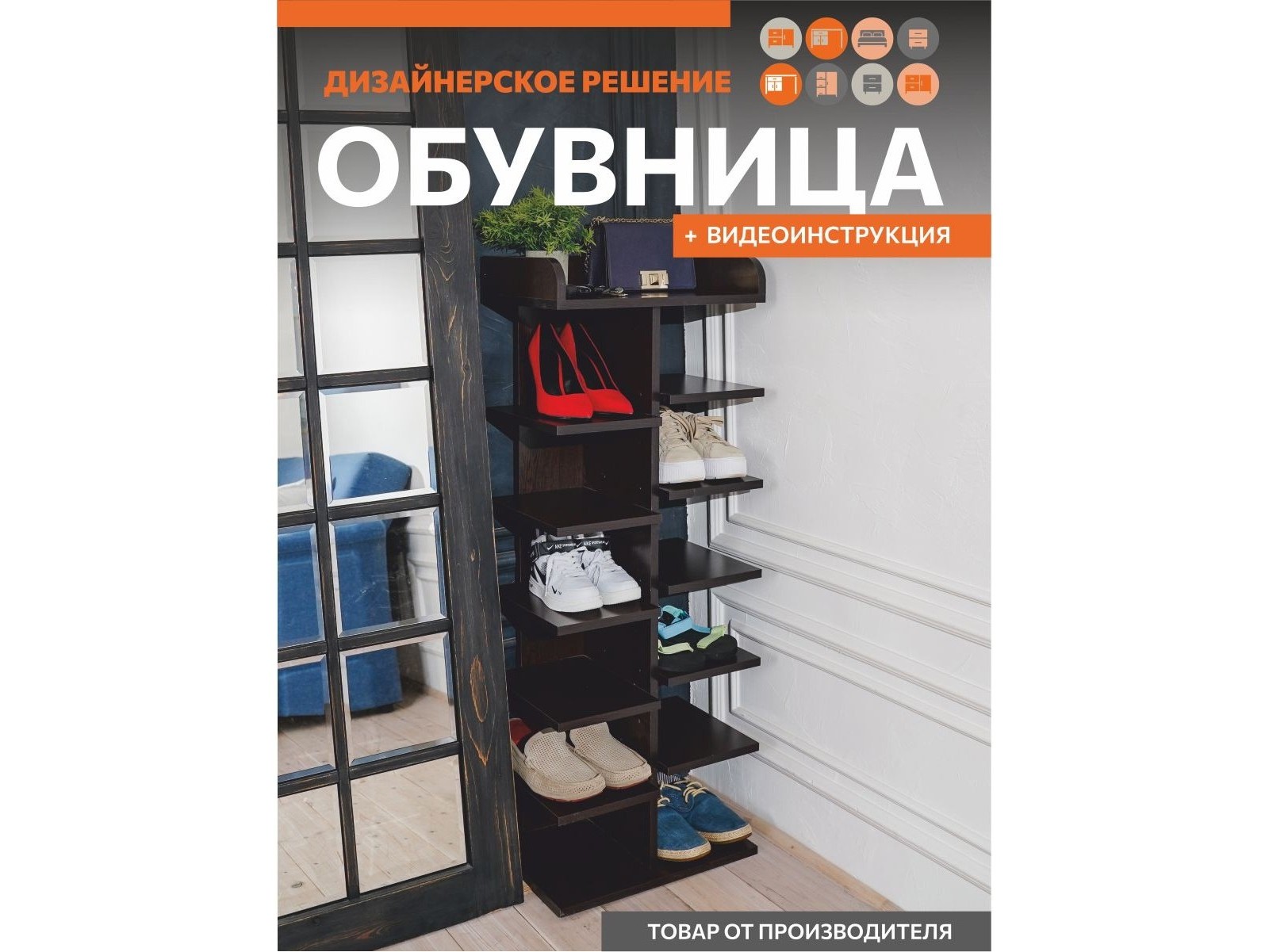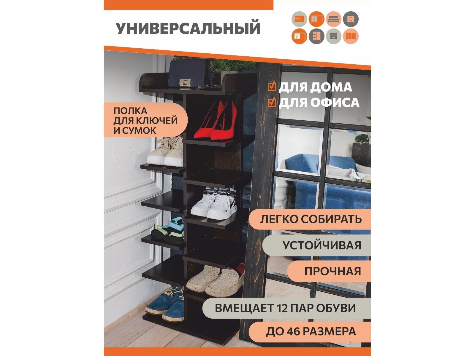Высокая и узкая обувница для обуви - экономия пространства в небольшом коридоре или прихожей. Открытые полки позволяют быстро находить нужную пару, а также компактная стойка вмещает обувь до 46-го размера, состоит из 12 полок + 1 верхняя длинная полочка для сумки и ключей.